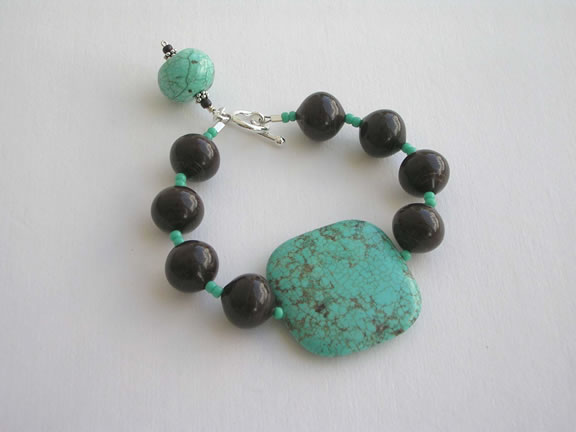 A large turquoise square makes it's own statement but a few chocolate (faintly swirled) vintage Lucite beads compliment it beautifully. Sterling silver toggle with chunky turquoise dangle.