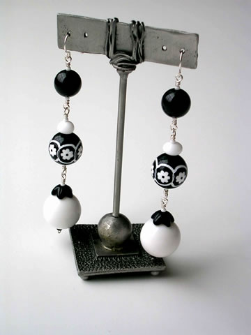 No shrinking violets here. Carved vintage Lucite--a rare find, is combined with black onyx and sterling silver wire to create a stunning pair of earrings!