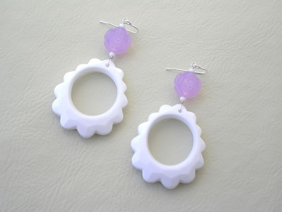 Fun and unusual vintage Lucite scalloped hoops need nothing more than a pretty pressed lilac rose to make them a stunning summer accessory. Sterling silver ear wires.