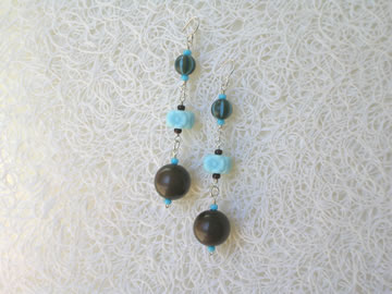 One of my favorite color combinations--light blue and chocolate brown is made even more interesting with these gorgeous beads. Vintage German glass flowers and vintage Lucite beads with stripes of light blue, chocolaty brown and olive compliment the larger brown moon glow beads to create a fun and unique bracelet. Sterling silver square toggle clasp and beaded dangle.
