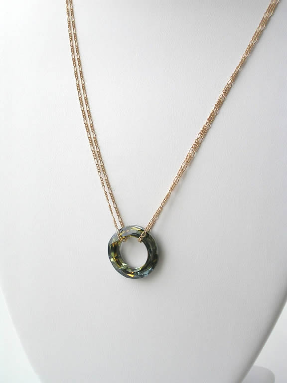 A new Swarovski bead called a cosmic ring is a complete circular crystal with no drilled holes. One side is a solid gold "foil" and the other side is translucent crystal in a color called "tabac" by Swarovski which is a mix of rich brown, golds and greens. The ring is flanked on both sides with an 18 inch length of 14K gold-filled chain gathered at the magnetic clasp with a small Swarovski crystal wrapped with gold wire. The crystal ring is 20mm or about the size of a 25 cent coin. Simple, elegant and striking!