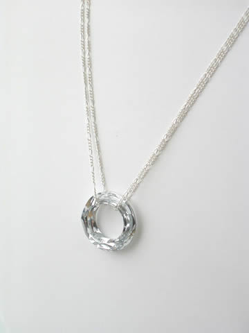 A new Swarovski bead called a cosmic ring is a complete circular crystal with no drilled holes. One side is a solid silver "foil" and the other side is clear crystal with the silver foil as the background making the crystal more intense. The ring is flanked on both sides with an 18 inch length of Sterling chain gathered at the magnetic clasp with a small Swarovski crystal wrapped with Sterling wire. The crystal ring is 20mm or about the size of a 25 cent coin. Simple, elegant and striking!