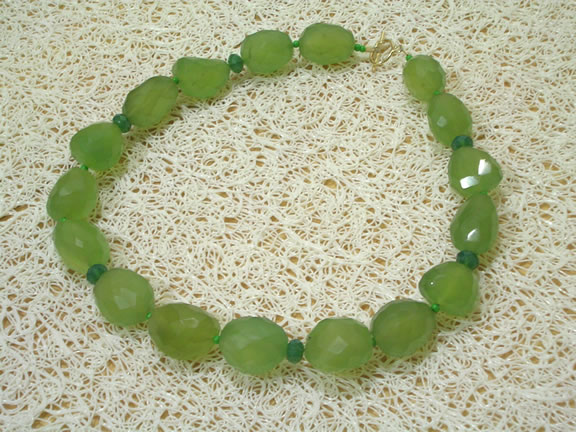 Large faceted green (dyed) Chalcedony, Palace Green Swarovski briolette beads and 14K gold-filled toggle clasp.