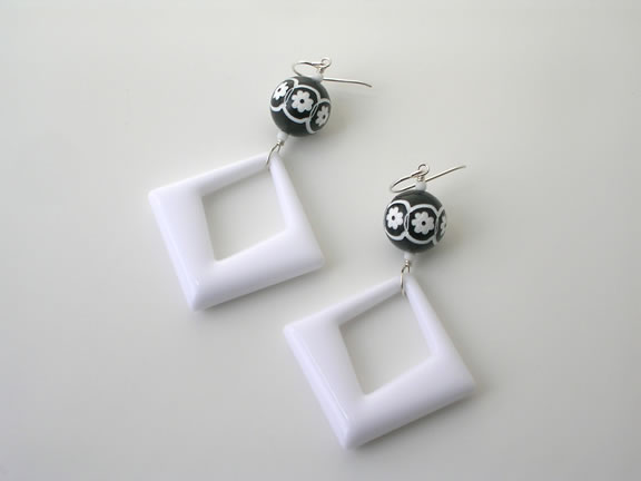 Vintage Lucite diamond-shaped hoops and carved floral beads on Sterling silver earwires.