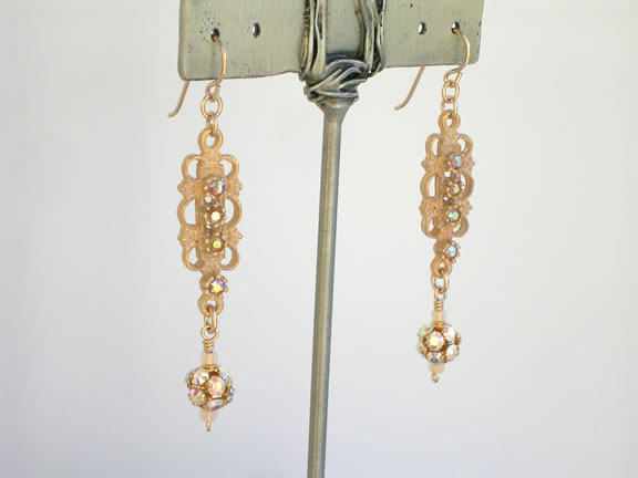Vintage metal filigree with rhinestones, Swarovski crystal fireballs and 14K gold-filled ear wires.